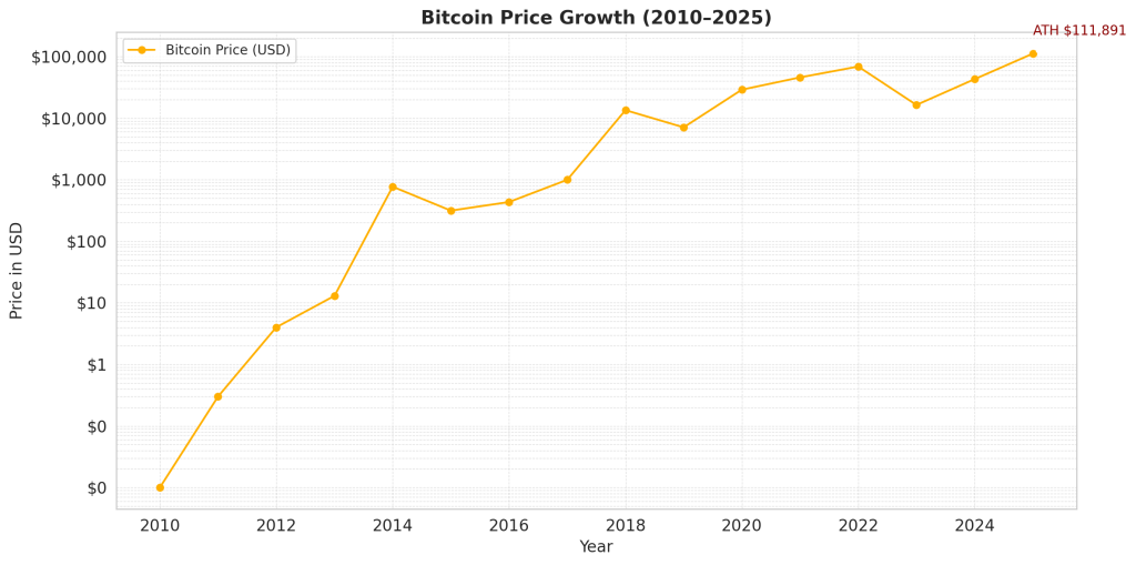 | 2025 | New All-Time High of $111,891.30 and $2.097T market cap. |